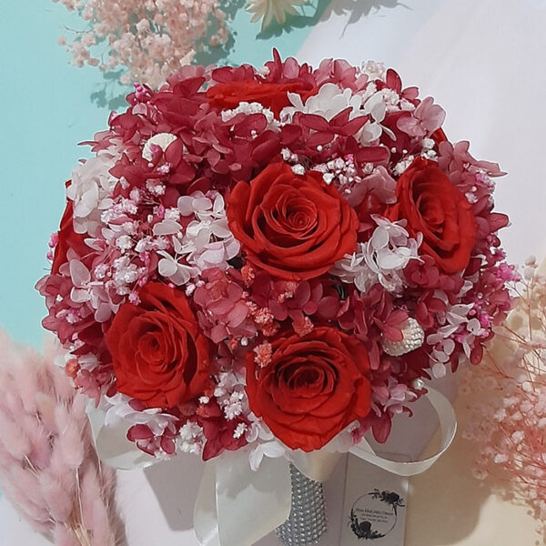 Bó hoa cưới gồm 9 hoa hồng nhung đỏ vĩnh cửu mix cùng cẩm tú cầu đỏ và baby trắng