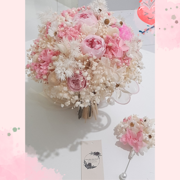 Bó hoa cưới hồng pastel với chất liệu hoa khô từ hoa tươi tự nhiên gồm hoa hồng Austin, hoa cẩm chướng, baby, cẩm tú cầu, cúc amobium, cúc nút áo,tùng kim