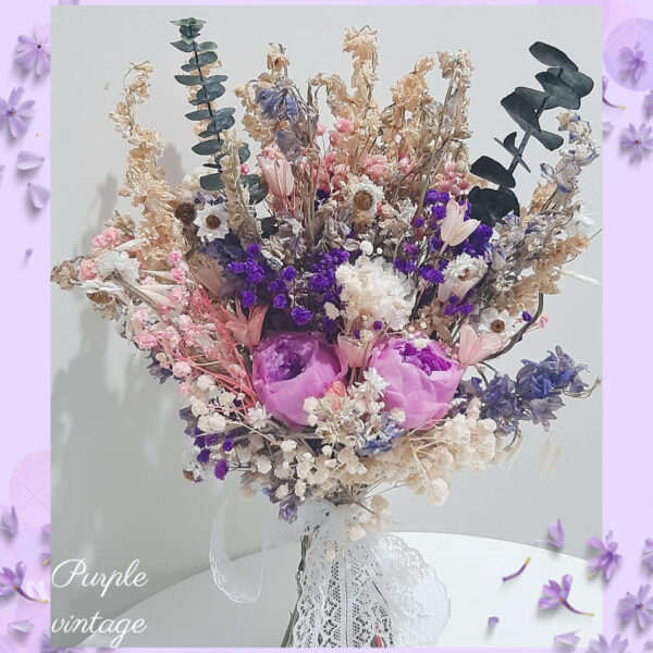 Bó hoa cưới với gam màu tím tượng trưng sự thuỷ chung lãng mạn gồm hoa hồng Austin tím kết hợp cùng hoa cẩm chướng, mix cùng baby, hoa phi yến, cúc amobium và lá khuynh diệp (silver dolar)